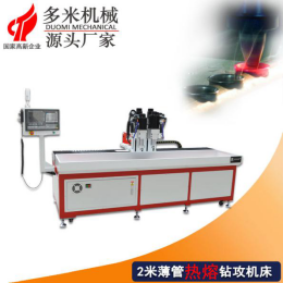 多米熱熔鉆攻機采用自主研發CNC數控系統,無需編程可直接導“CAD”圖檔生成程序。雙主軸分別裝夾熱熔鉆頭和擠壓絲錐,一次裝夾完成拉伸孔和攻絲兩道工序,節省時間的同時也避免二次裝夾帶來的誤差。熱熔鉆攻機主軸添加散熱裝置,因為熱熔鉆是通過特殊的熱熔鉆頭部與產品表面摩擦鉆孔,會有700~800度上下的高溫,主軸加散熱裝置,可以降低連續鉆孔而產生的熱量,也可以延長熱熔鉆的壽命,最主要還可以保證熱熔鉆攻機的主軸(內部結構的刀桿和本體)不會因過高的溫度而損壞。